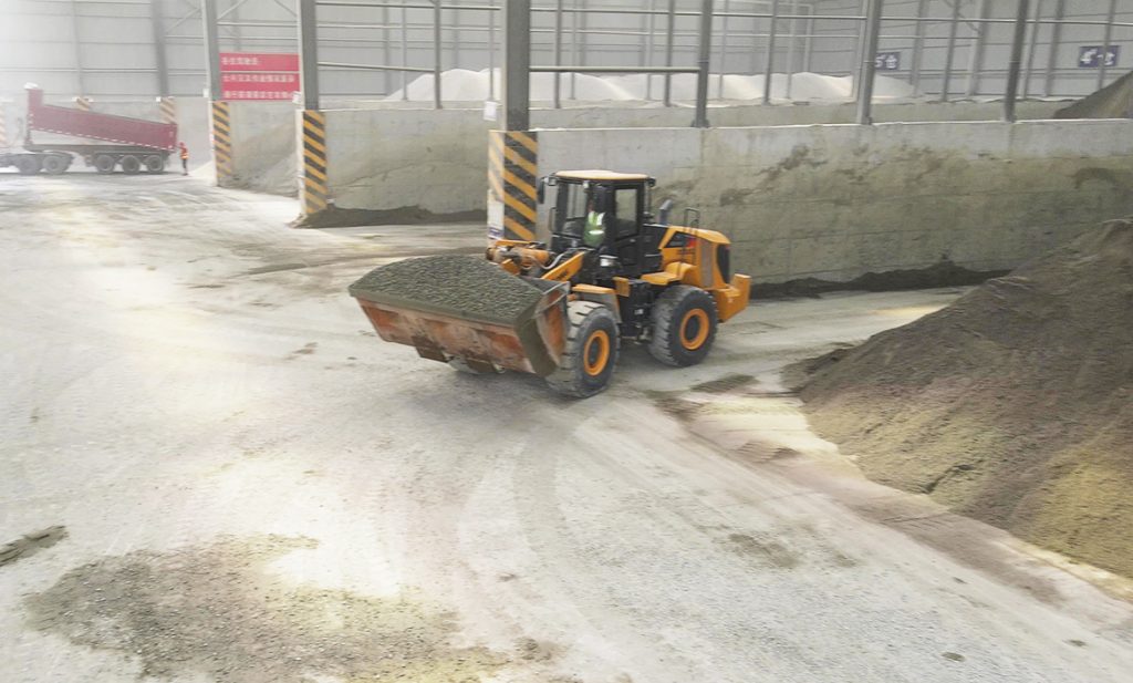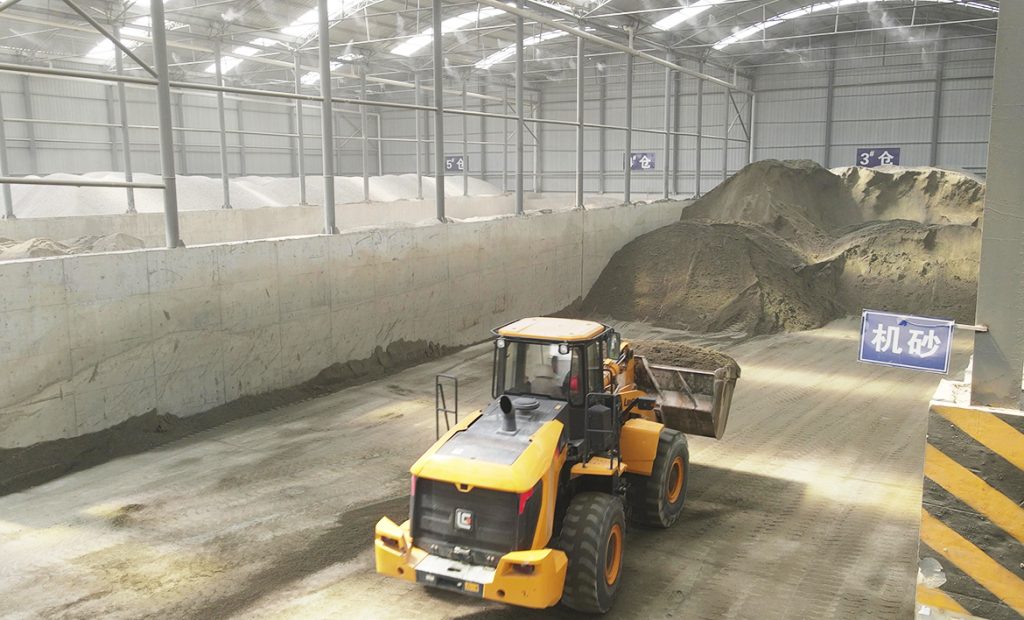 堆滿砂石的攪拌廠內(nèi),天一剛亮就開始忙碌起來。4臺(tái)黃色的柳工裝載機(jī),不停在料堆之間往返——2臺(tái)856H負(fù)責(zé)挖料,1臺(tái)856H MAX收料,另一臺(tái)較大的870H則是不斷地往攪拌站中送入砂石。片刻之后,在攪拌站的另一頭,已經(jīng)混合均勻的混凝土被排在廠門口的一隊(duì)隊(duì)卡車?yán)煌さ亍?/p>